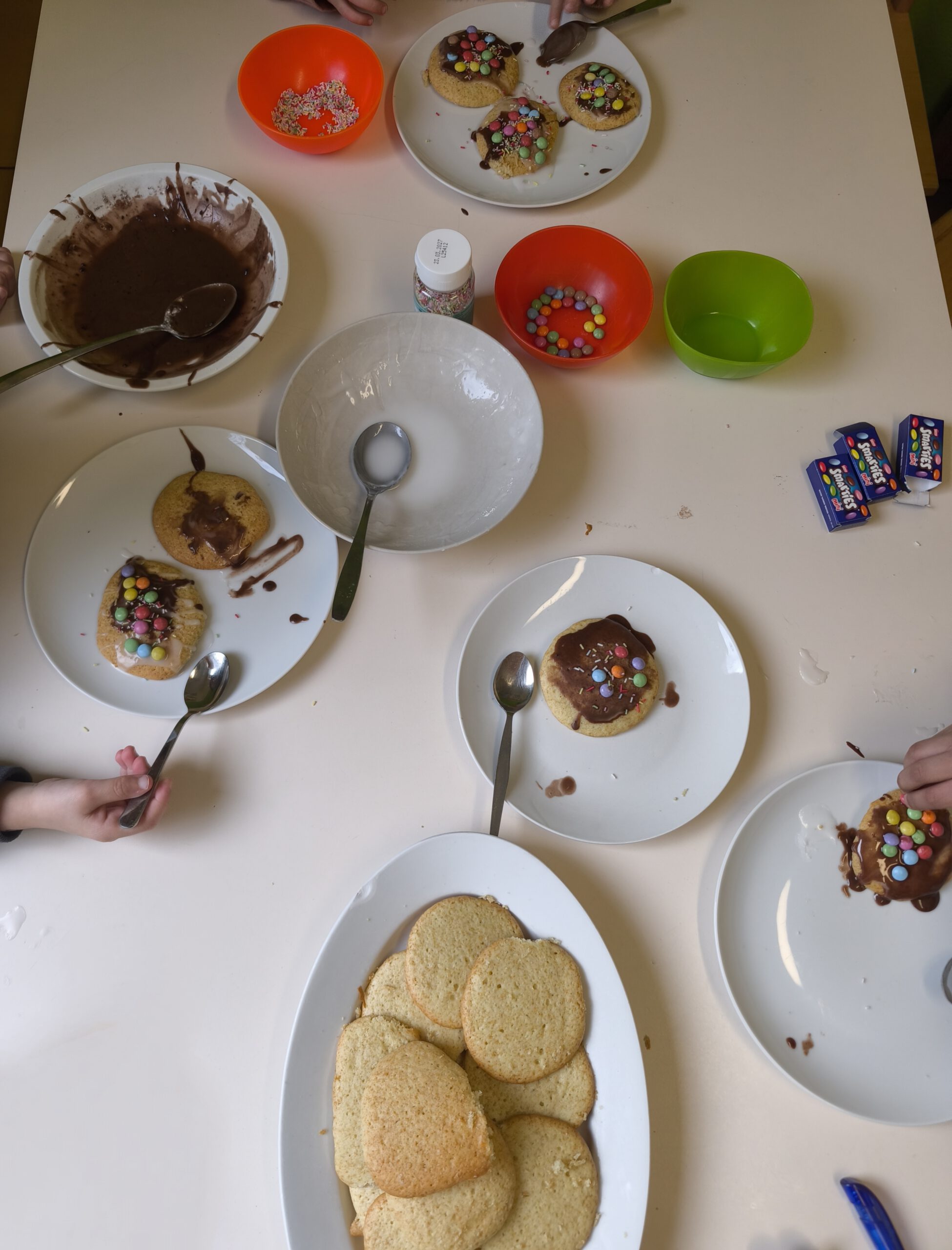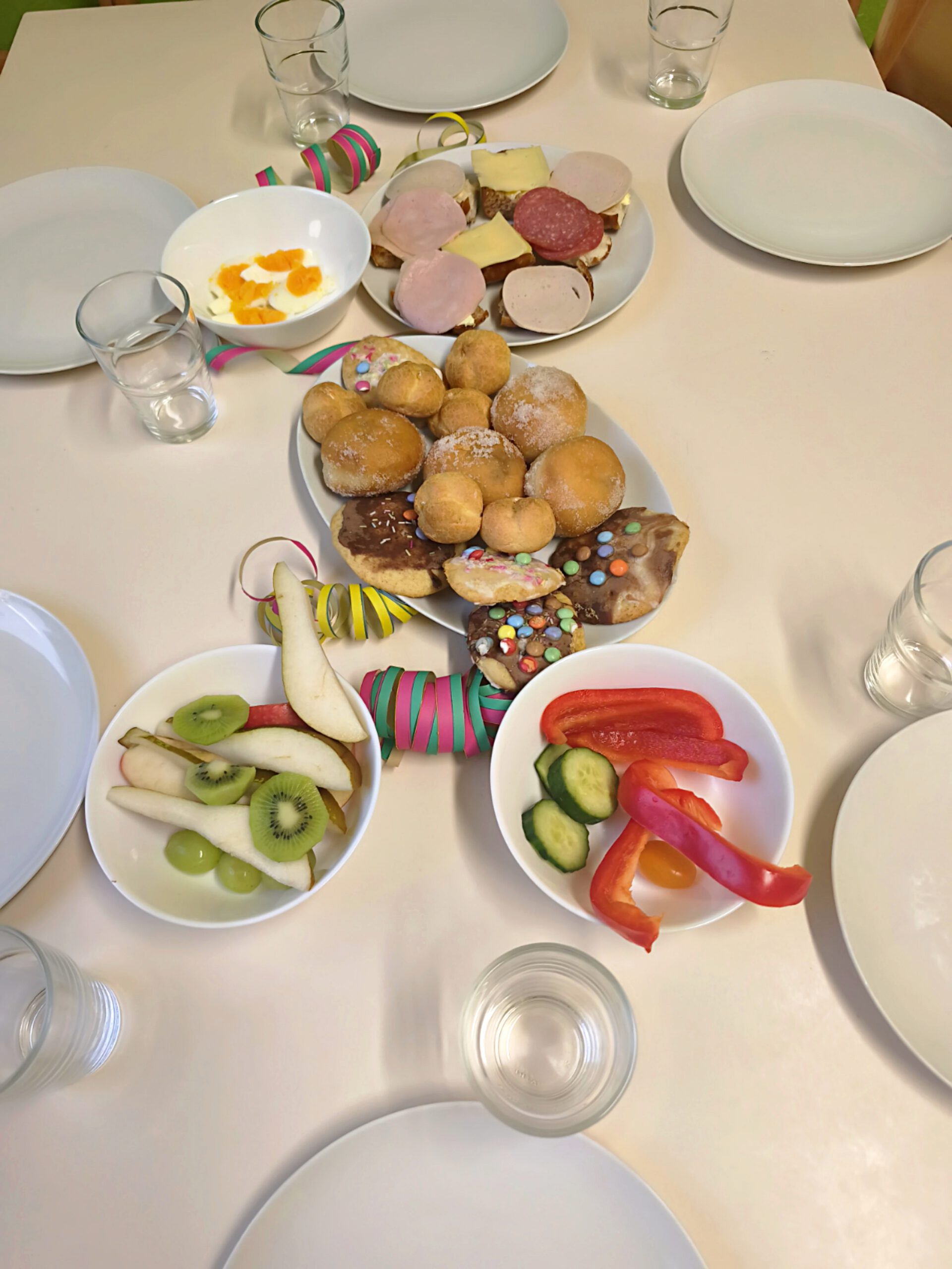 Gemütlich starteten wir mit einer kleinen Faschingsdisko, bevor wir uns erstmal beim gemeinsamen Frühstück stärkten. Die Kinder haben im Vorfeld selbst Amerikaner gebacken und diese mit Zuckerguss, Streusel und Smarties verziert. Außerdem gab es Mini-Krapfen, Windbeutel und leckere Laugensnacks. Natürlich durfte auch frisches Obst und Gemüse nicht fehlen, sodass für jeden Geschmack etwas dabei war.
