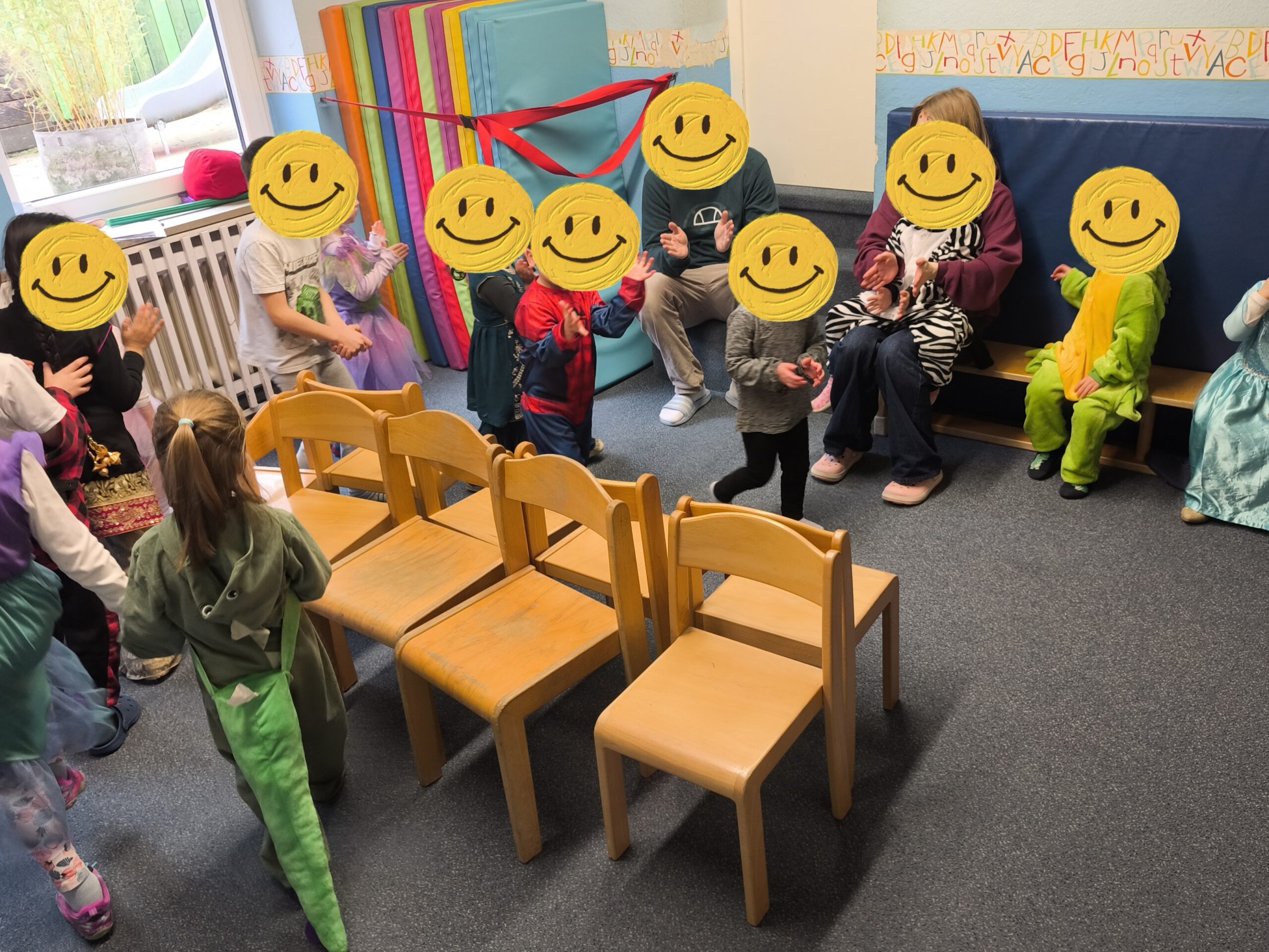 Im Anschluss warteten viele lustige Faschingsspiele auf die Kinder. Eine fröhliche Polonaise zog durch den ganzen Kindergarten. Bei der „Reise nach Jerusalem“ ging es um Reaktionsfähigkeit. Beim „Brezel schnappen“ war Geschicklichkeit gefragt, während das Schokokuss-Wettessen für besonders viel Heiterkeit sorgte. Beim Luftballontanz hingegen stand die Freude an der Bewegung im Vordergrund.